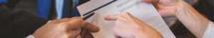 Just signing in. Hotel receptionist showing for guests where to put his signature on letterhead